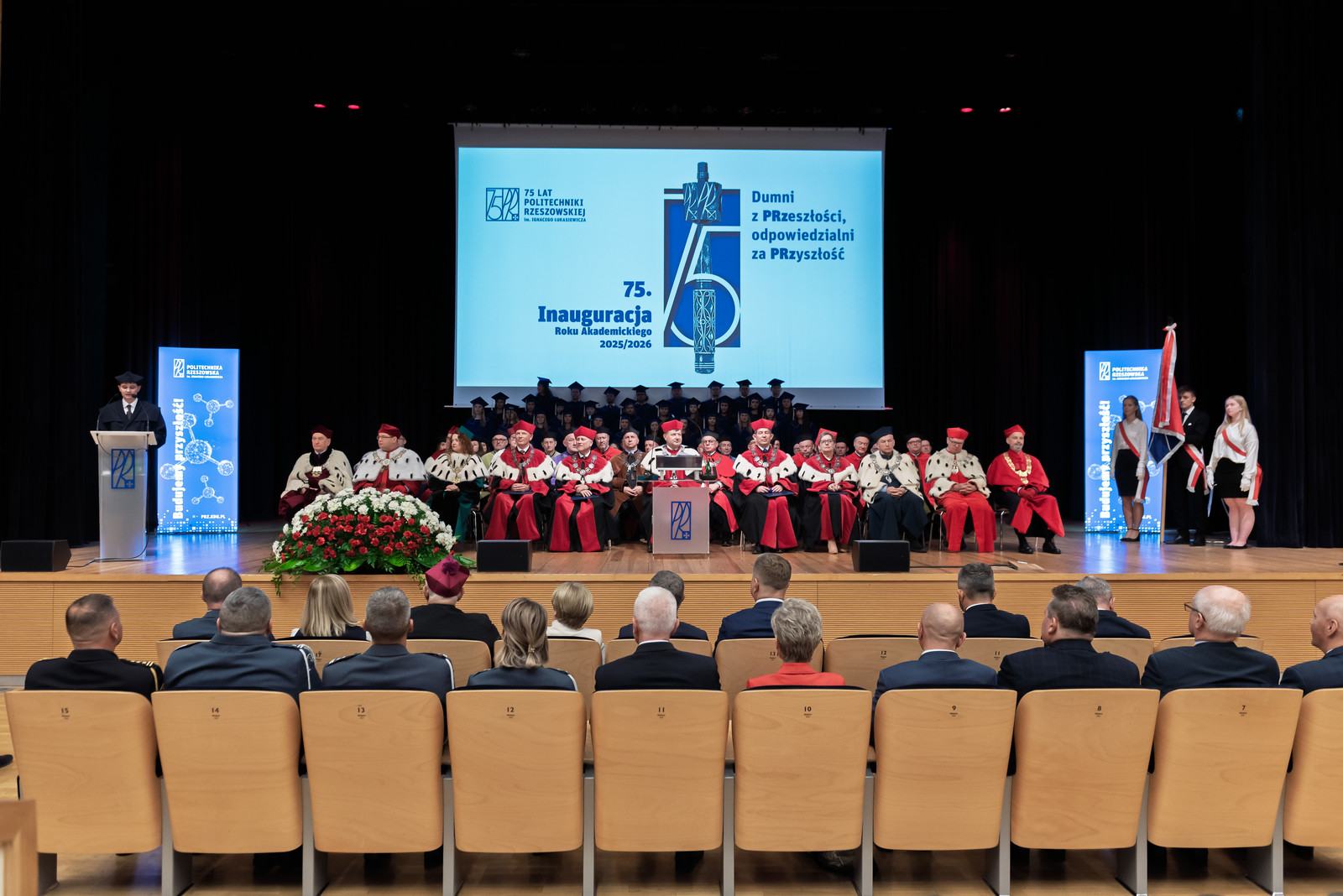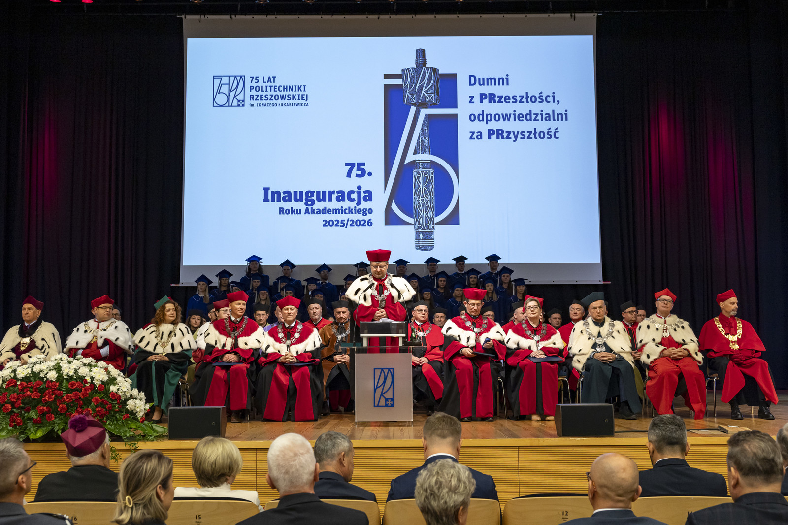 „Inauguracja roku akademickiego to nie tylko uroczystość, to także moment refleksji nad tym, czym jest uczelnia, kim jesteśmy jako jej członkowie i dokąd zmierzamy. W świecie pełnym niepewności uczelnia pozostaje jednym z ostatnich bastionów racjonalności, otwartości i dialogu. To nasza odpowiedzialność – chronić te wartości i przekazywać je kolejnym pokoleniom” – mówił rektor prof. Piotr Koszelnik podczas przemówienia inaugurującego jubileuszowy 75. rok akademicki na Politechnice Rzeszowskiej.