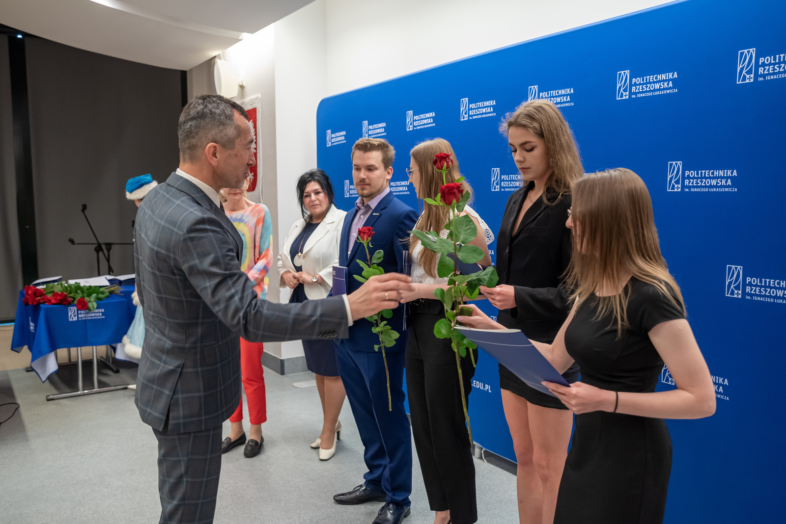 Uroczystość rozpoczęła się miłym artystycznym akcentem, jakim był występem wokalny dwóch wyróżnionych studentek z Wydziału Matematyki i Fizyki Stosowanej – Katarzyny Bieli i Klaudii Bukały. Następnie prorektor ds. kształcenia dr hab. Iwona Włoch, prof. PRz i prorektor ds. studenckich prof. dr hab. Grzegorz Ostasz wręczyli nagrody i lity gratulacyjne studentom. „Razem z panią prof. Iwoną Włoch mamy ogromną satysfakcję, wręczając w imieniu JM Rektora nagrody tak licznej grupie studentów naszej Politechniki. Wyróżnieni zostali nie tylko przedstawiciele wszystkich wydziałów, ale też liderzy Samorządu Studenckiego oraz grupa sportowców reprezentująca Akademicki Związek Sportowy. Wszyscy Państwo świetnie pokazaliście, że można łączyć obowiązki studenta z prawdziwą pasją na różnych płaszczyznach. Serdecznie wszystkim gratulujemy" - powiedział prof. G. Ostasz.