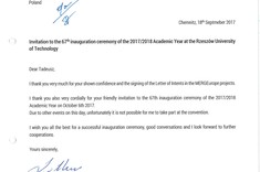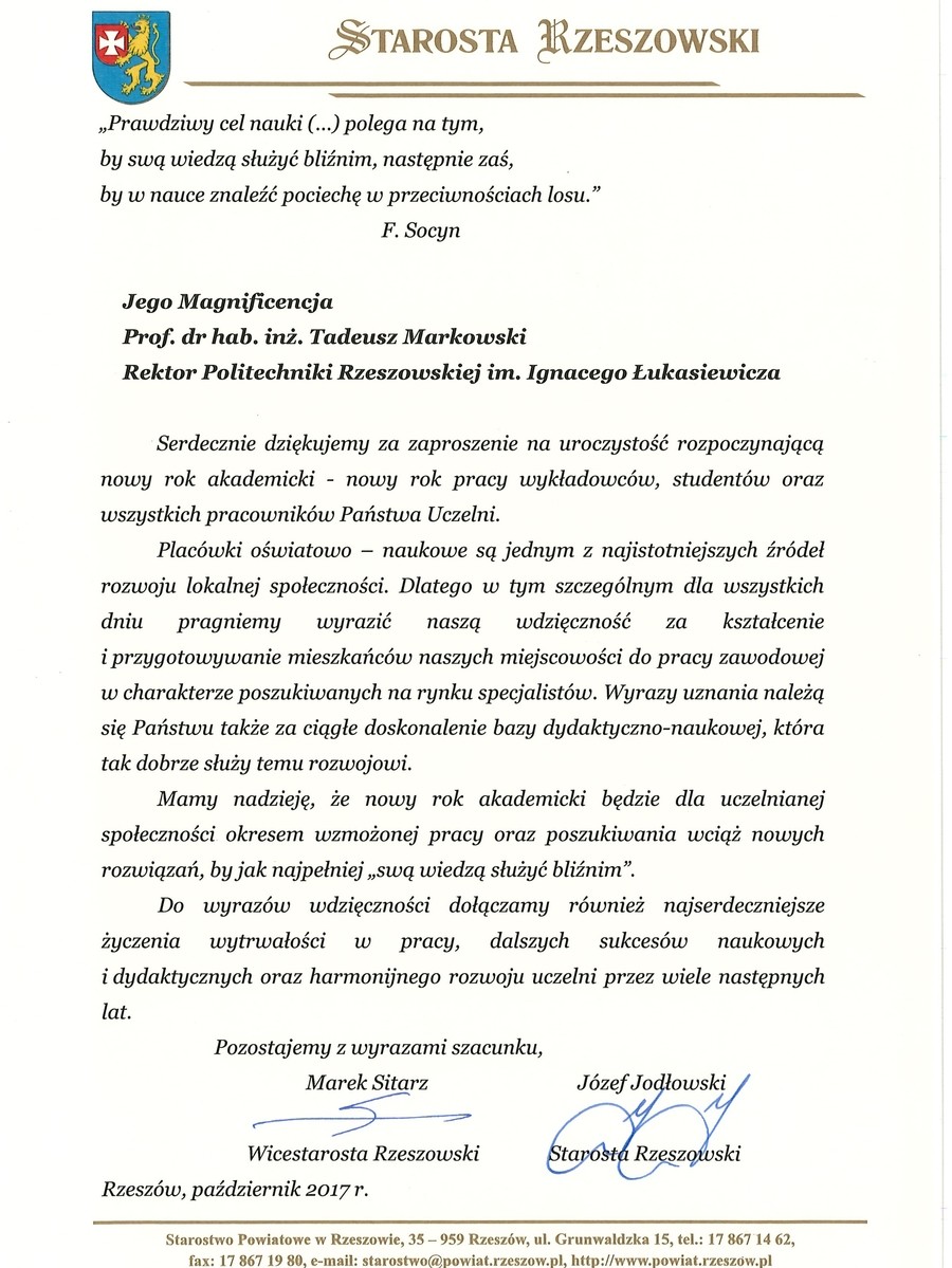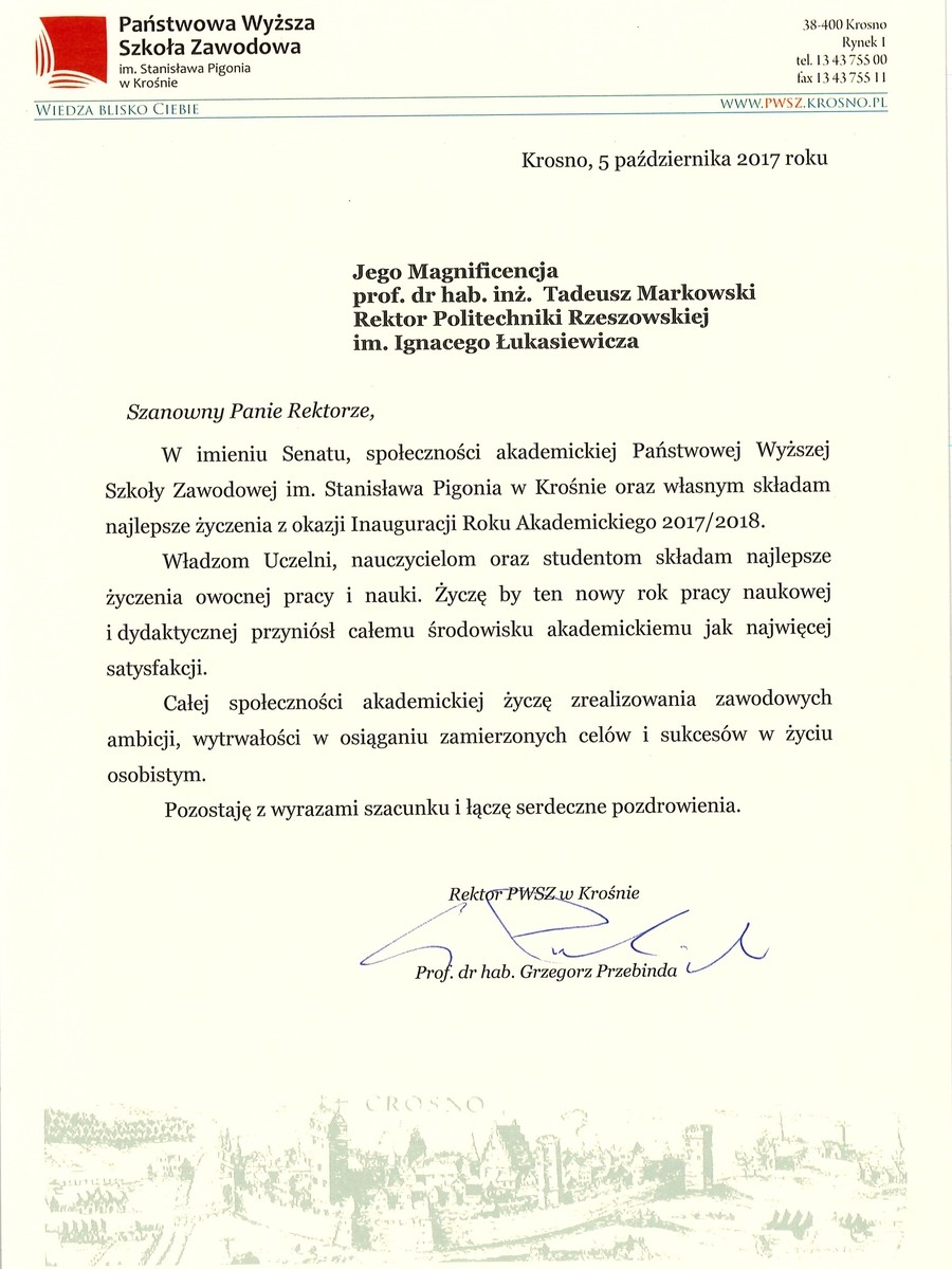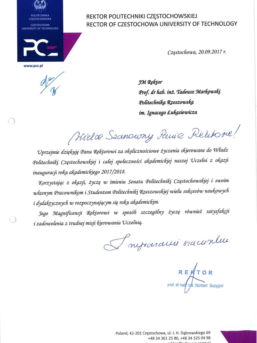 Ponad 30 listów gratulacyjnych z życzeniami sukcesów i dalszego rozwoju otrzymała Politechnika Rzeszowska z okazji rozpoczęcia nowego roku akademickiego. Ich autorami są przedstawiciele najwyższych władz państwowych, parlamentarzyści, duchowni i samorządowcy. Listy gratulacyjne dotarły także z różnych ośrodków naukowych z całej Polski.