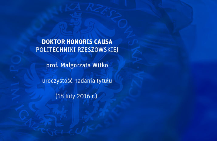 18 lutego 2016 r. o godz. 12.15, podczas uroczystego posiedzenia Senatu Politechniki Rzeszowskiej odbędzie się uroczyste nadanie tytułu doktora honoris causa Politechniki Rzeszowskiej. Tytuł ten otrzyma prof. dr hab. Małgorzata Witko.