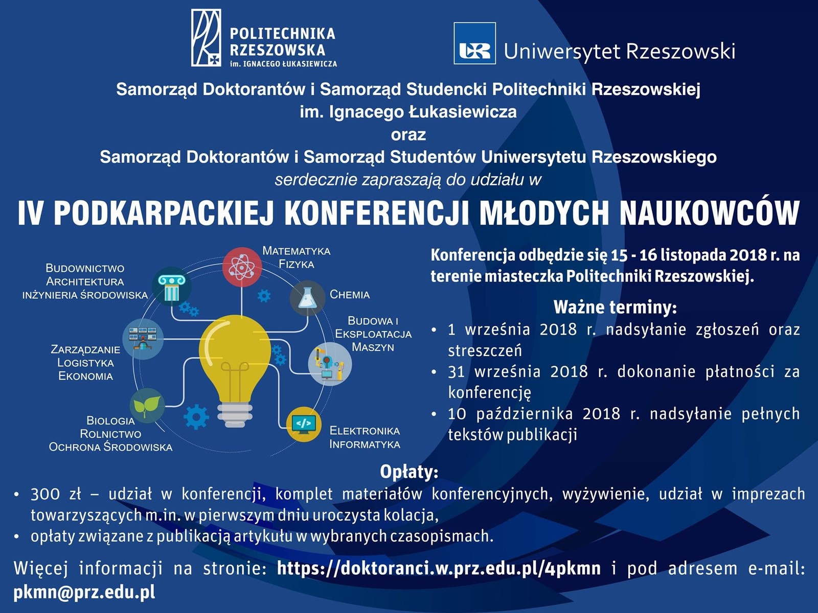 Samorząd Doktorantów i Samorząd Studencki Politechniki Rzeszowskiej im. Ignacego Łukasiewicza oraz Samorząd Doktorantów i Samorząd Studentów Uniwersytetu Rzeszowskiego serdecznie zapraszają do udziału w IV Podkarpackiej Konferencji Młodych Naukowców, która odbędzie się w dniach 15-16 listopada 2018 r. na miasteczku Politechniki Rzeszowskiej. Jej celem jest integracja przedstawicieli młodego pokolenia naukowców z różnych środowisk naukowych oraz wskazanie studentom możliwości dalszego rozwoju w pracy naukowej. Udział w konferencji oraz publikacje dają większe szanse w procesie rekrutacji do Szkół Doktorskich.