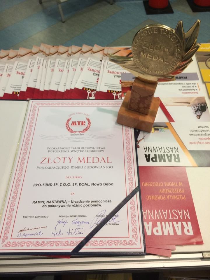 Wynalazek pracowników Katedry Konstrukcji Maszyn PRz dr. hab. inż. Sławomira Miechowicza, prof. PRz, i mgr. inż. Pawła Fudalego (prawo do patentu zostało sprzedane przez naszą uczelnię firmie PRO-FUND w 2012 r.) podczas 22. Targów Budownictwa, Wyposażenia Wnętrz i Ogrodów EXPO DOM otrzymał Złoty Medal Podkarpackiego Rynku Budowlanego. Nagrodzone urządzenie to rampa nastawna.